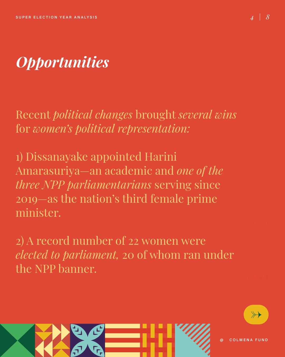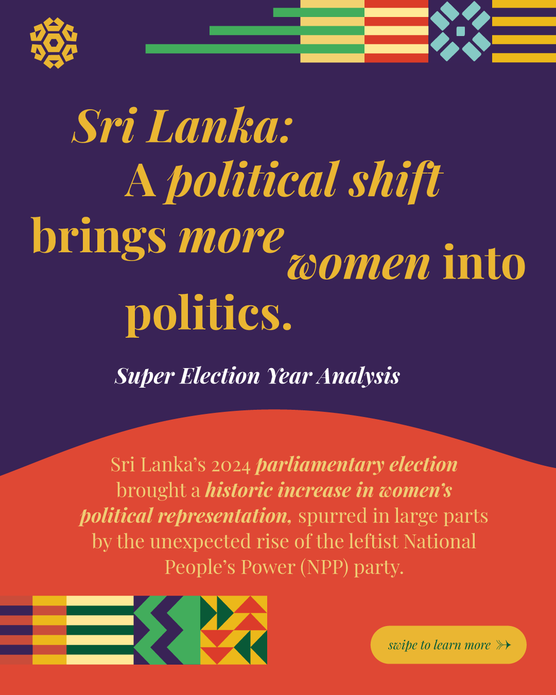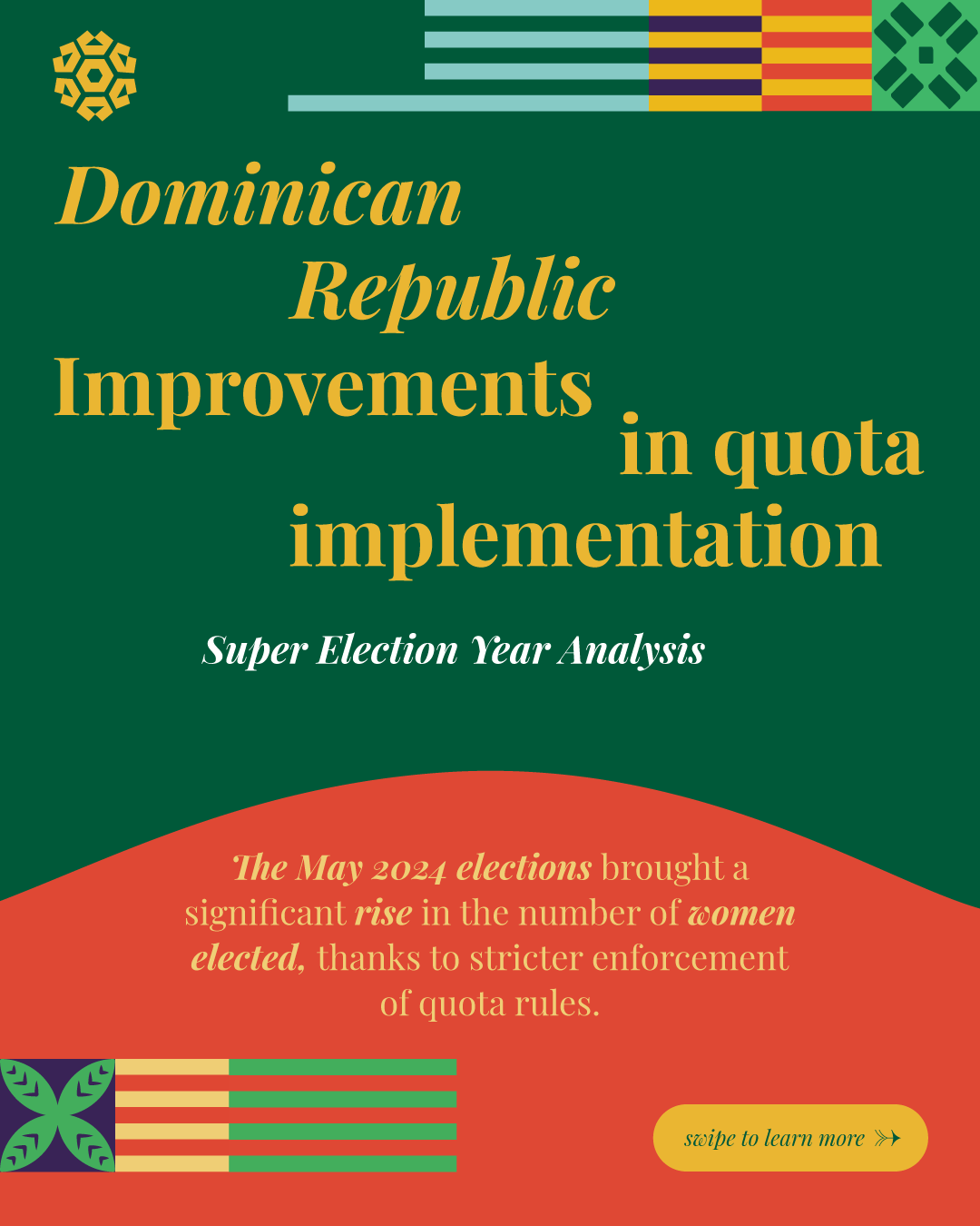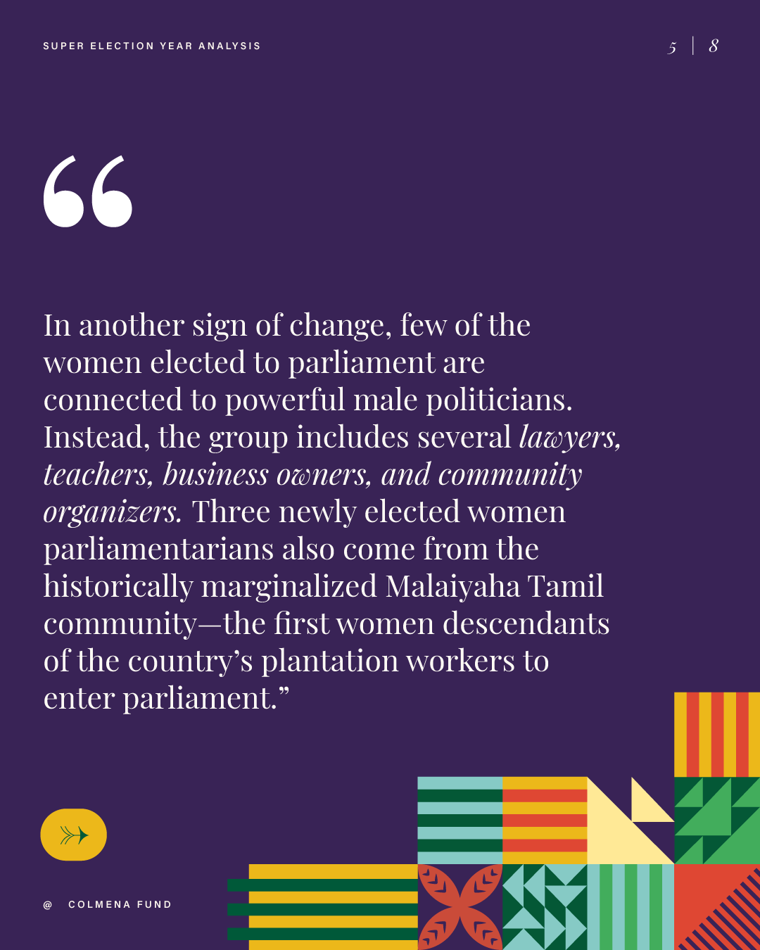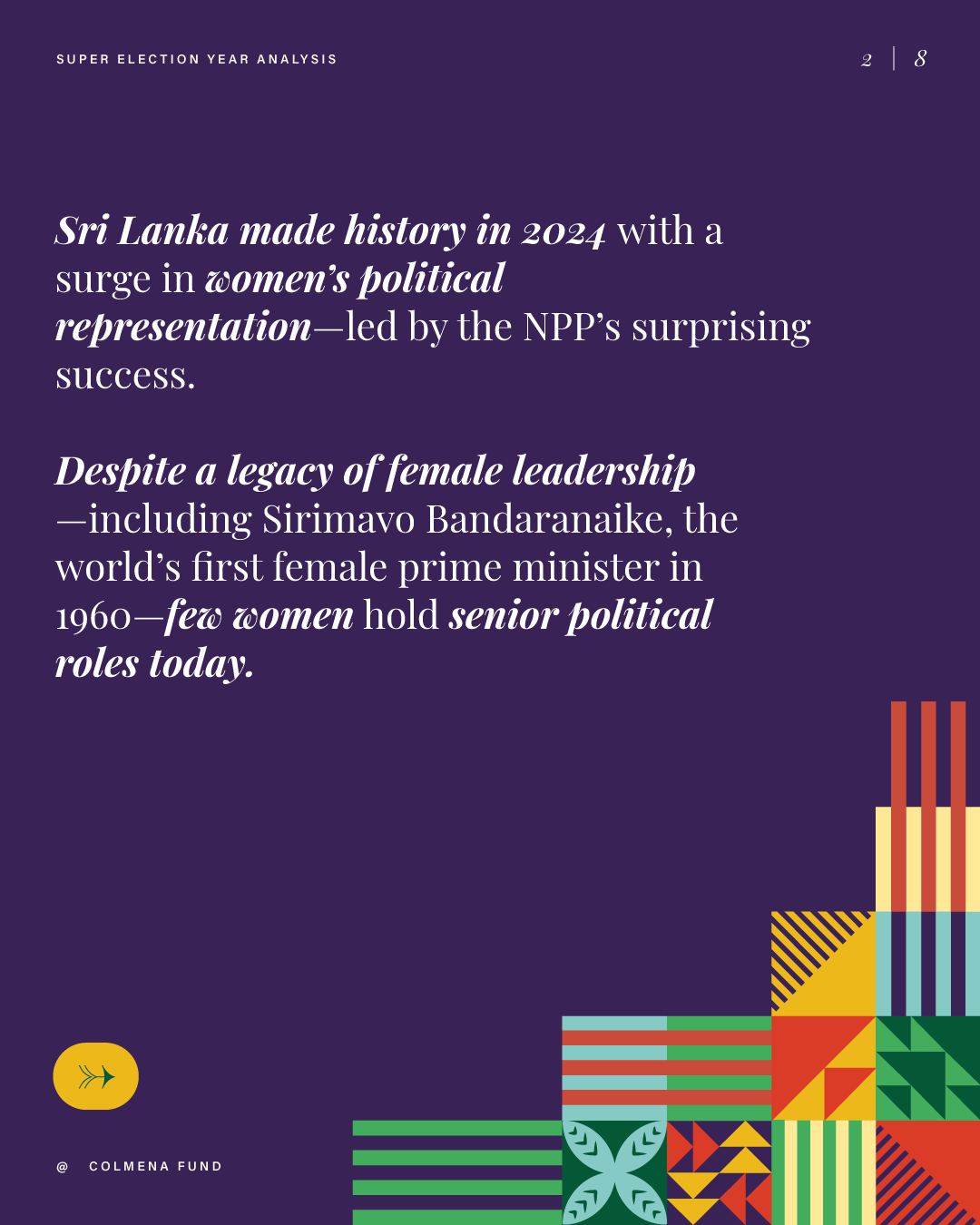 This report analyzes advances and setbacks in women’s political representation in 2024, building on the mid-year assessment published by the Colmena Fund for Women’s Political Power in October. It begins by examining global trend lines in women’s parliamentary and executive representation, highlighting both progress and backsliding. It then turns to four countries that held significant elections over the past year and interrogates their impact on women’s political power: the Dominican Republic, India, South Africa, and Sri Lanka. To close, the analysis draws attention to several broader themes that emerged from the electoral contests of the past year.