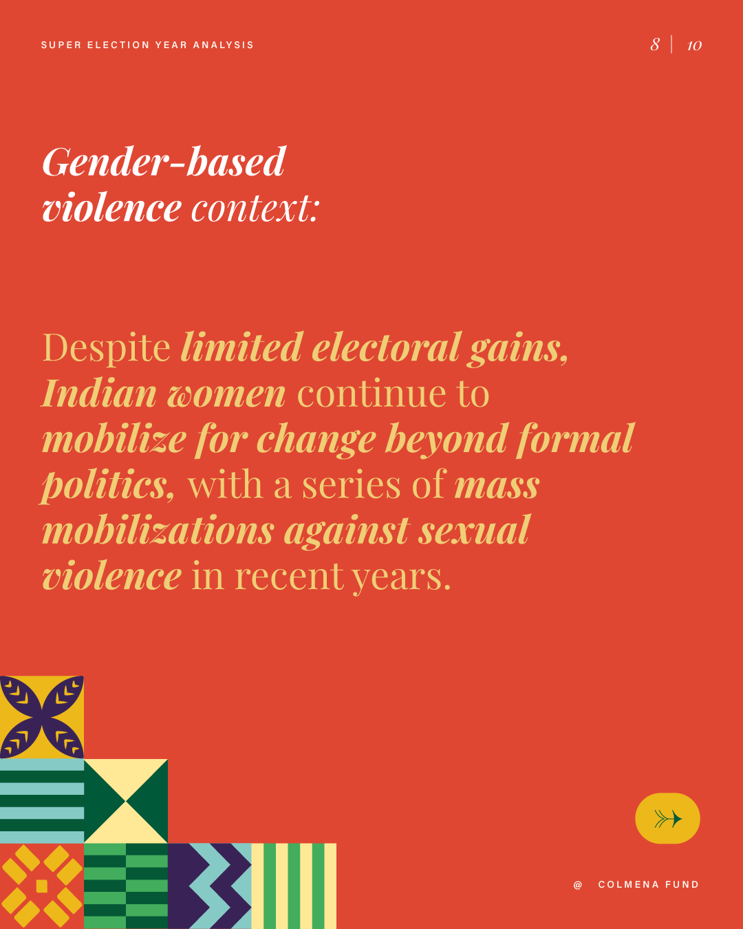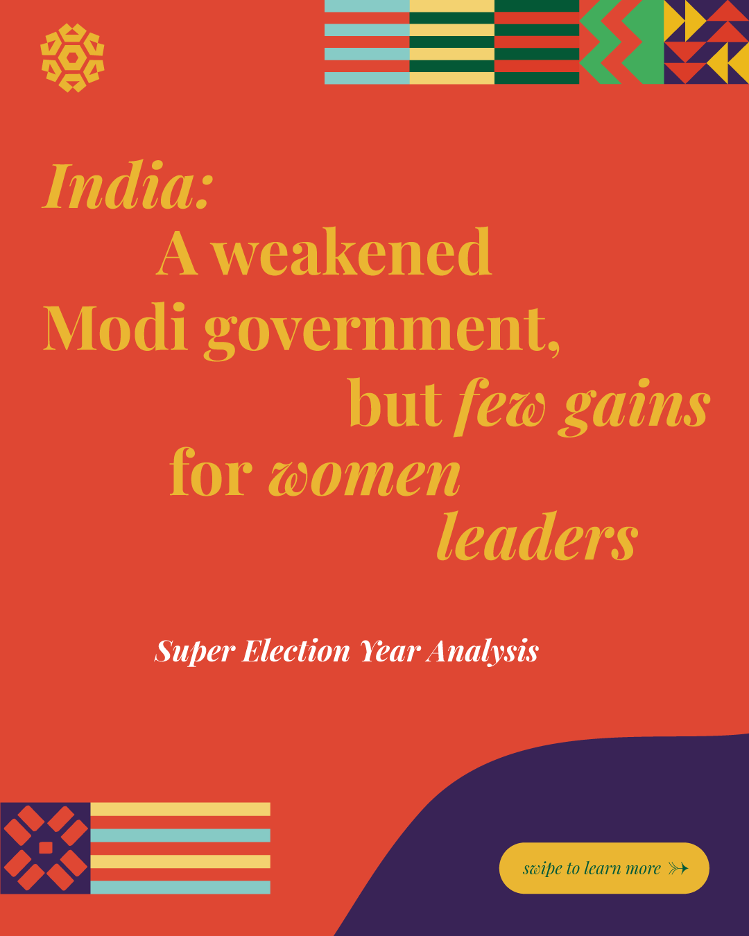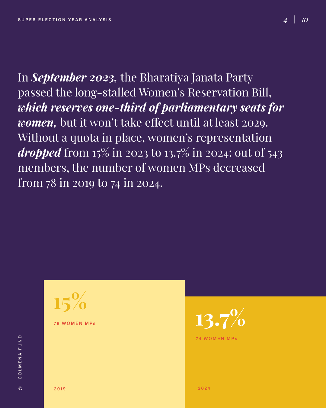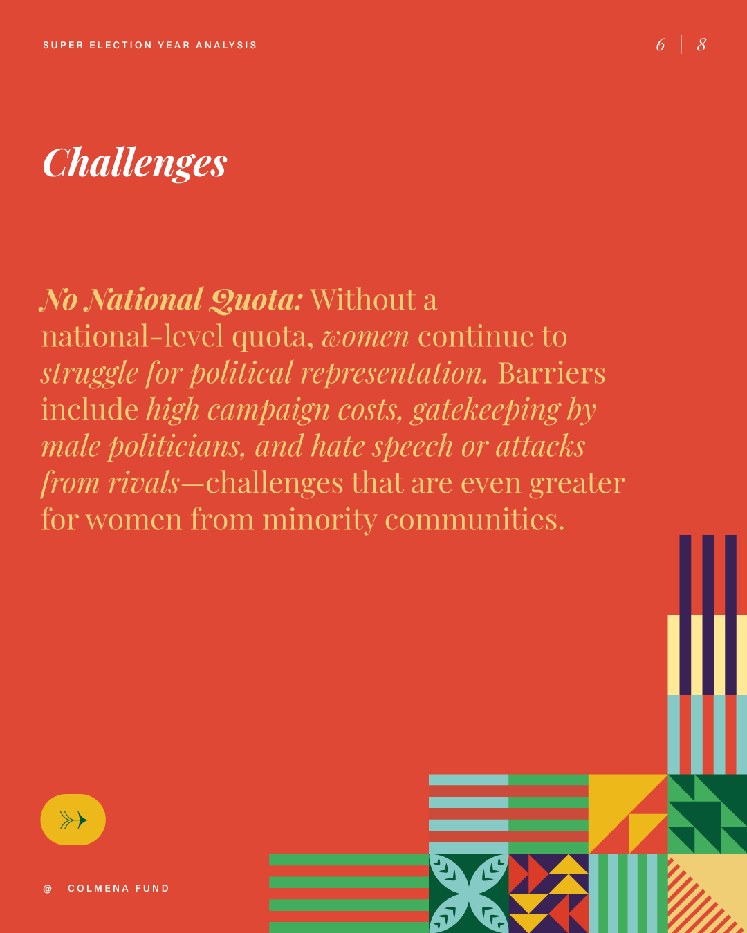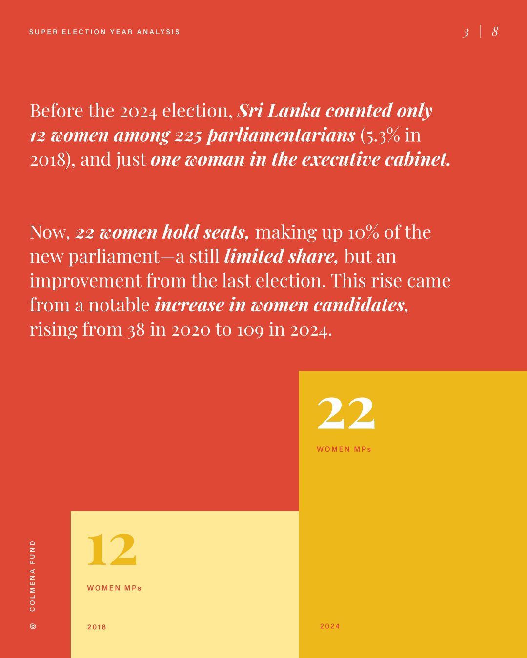This report analyzes advances and setbacks in women’s political representation in 2024, building on the mid-year assessment published by the Colmena Fund for Women’s Political Power in October. It begins by examining global trend lines in women’s parliamentary and executive representation, highlighting both progress and backsliding. It then turns to four countries that held significant elections over the past year and interrogates their impact on women’s political power: the Dominican Republic, India, South Africa, and Sri Lanka. To close, the analysis draws attention to several broader themes that emerged from the electoral contests of the past year.