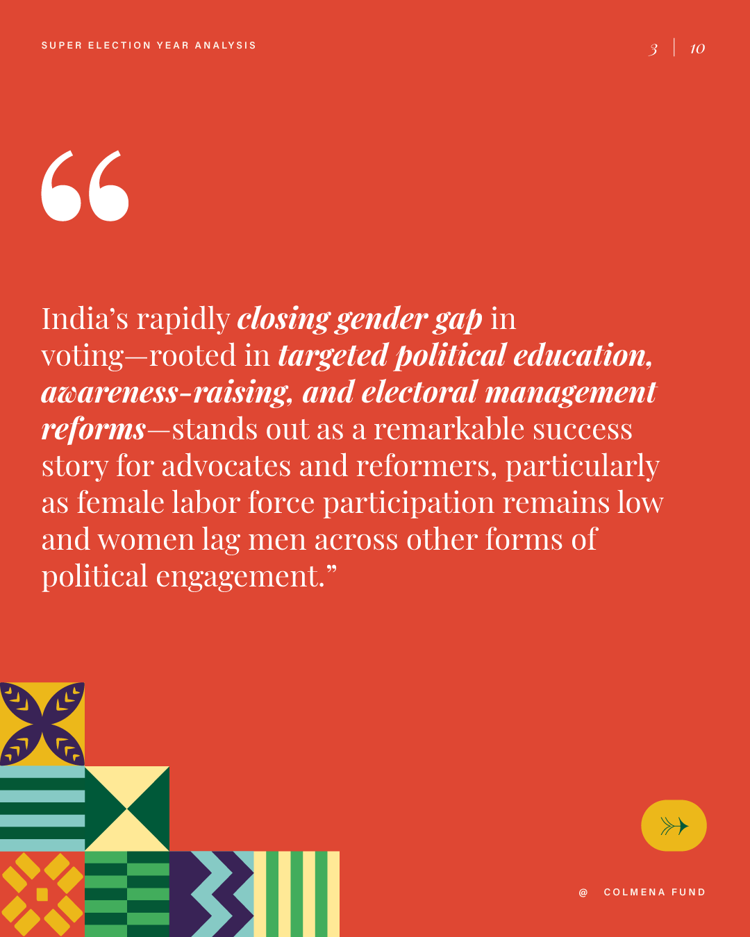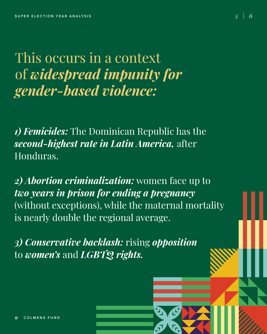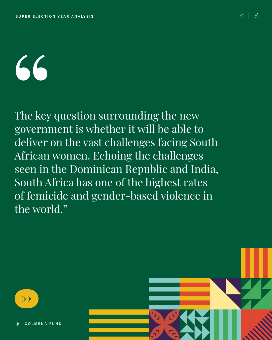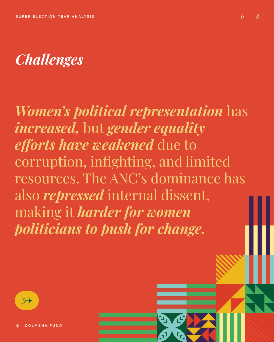 This report analyzes advances and setbacks in women’s political representation in 2024, building on the mid-year assessment published by the Colmena Fund for Women’s Political Power in October. It begins by examining global trend lines in women’s parliamentary and executive representation, highlighting both progress and backsliding. It then turns to four countries that held significant elections over the past year and interrogates their impact on women’s political power: the Dominican Republic, India, South Africa, and Sri Lanka. To close, the analysis draws attention to several broader themes that emerged from the electoral contests of the past year.