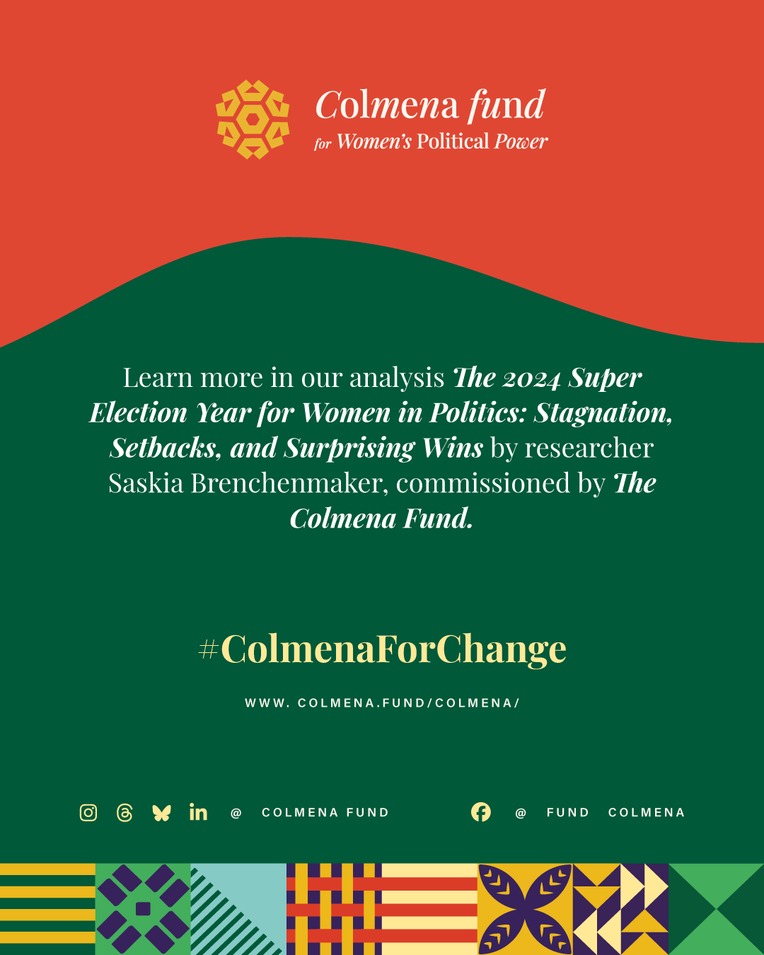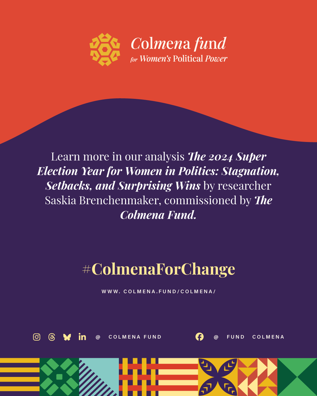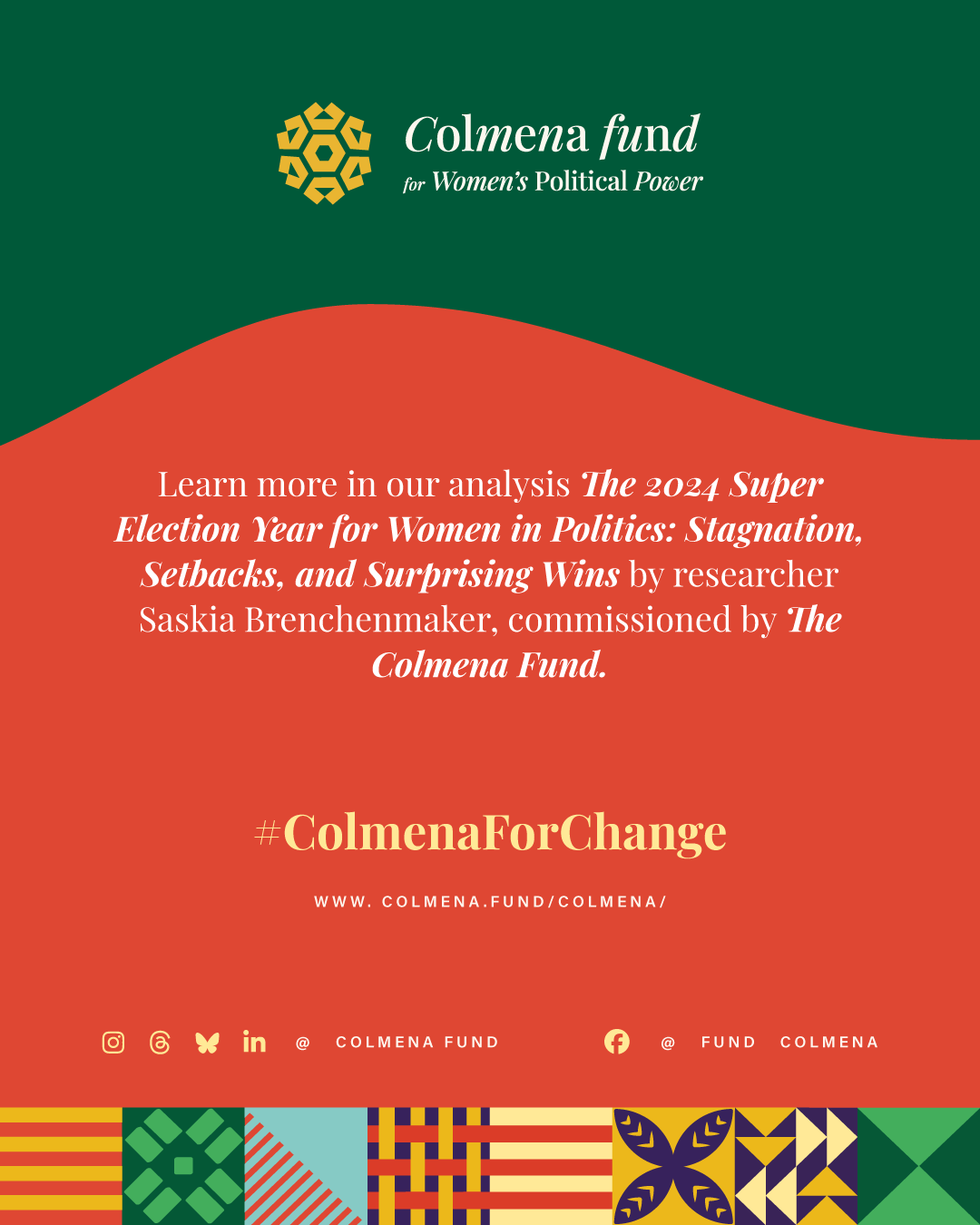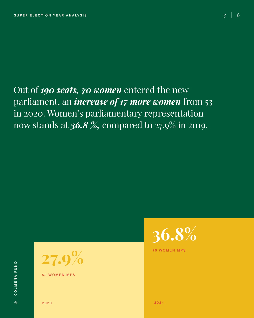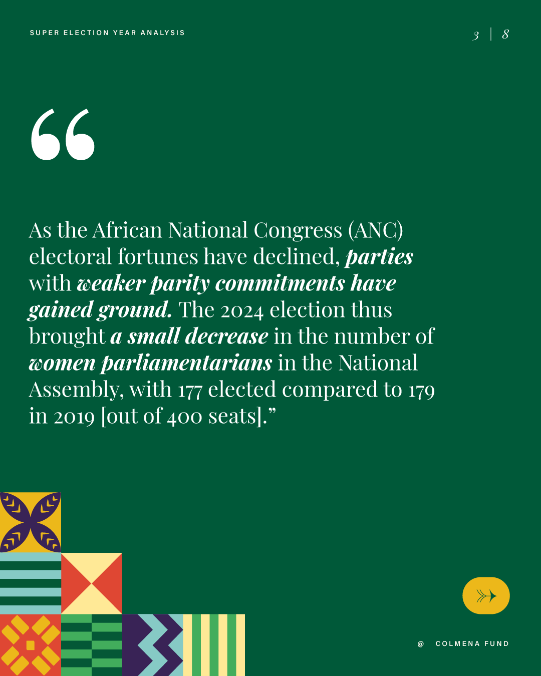 This report analyzes advances and setbacks in women’s political representation in 2024, building on the mid-year assessment published by the Colmena Fund for Women’s Political Power in October. It begins by examining global trend lines in women’s parliamentary and executive representation, highlighting both progress and backsliding. It then turns to four countries that held significant elections over the past year and interrogates their impact on women’s political power: the Dominican Republic, India, South Africa, and Sri Lanka. To close, the analysis draws attention to several broader themes that emerged from the electoral contests of the past year.
